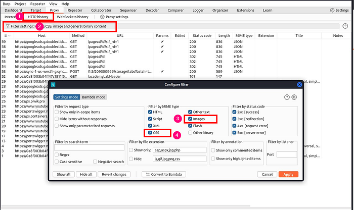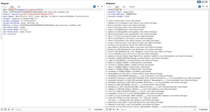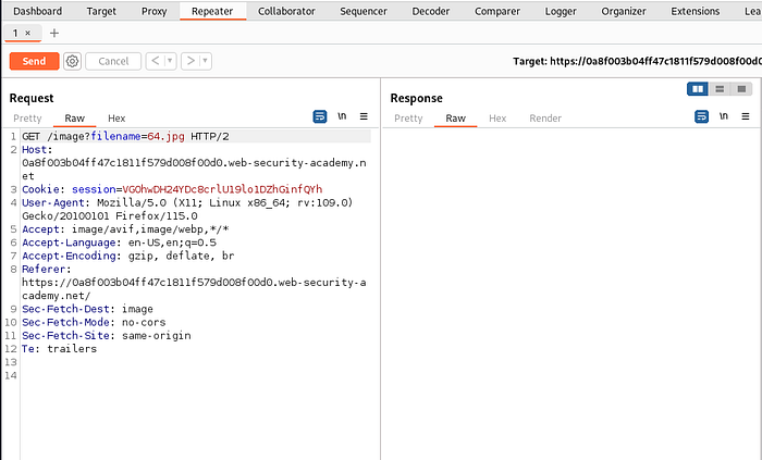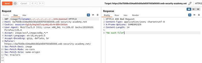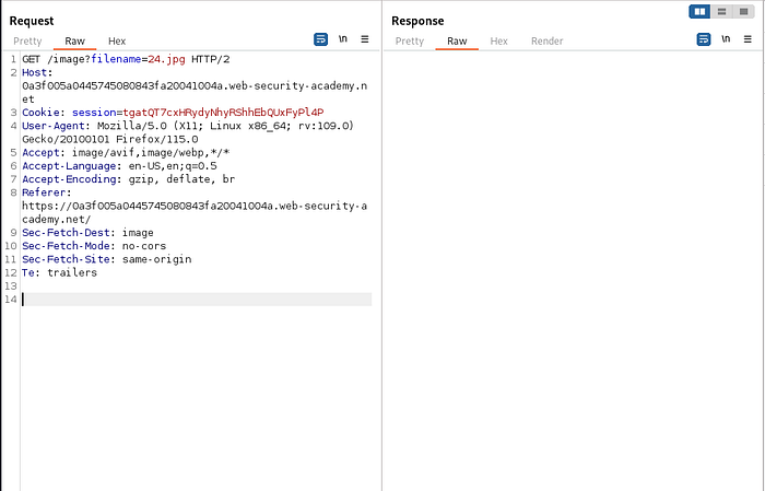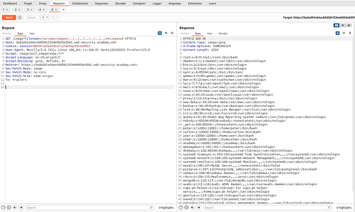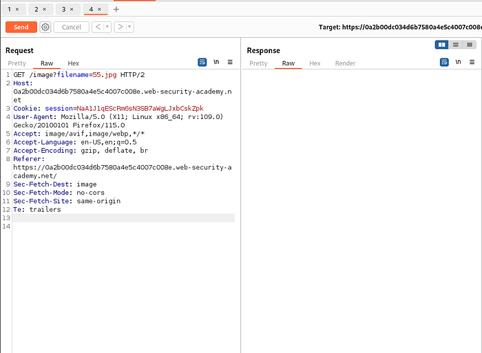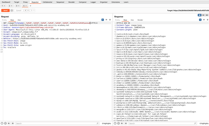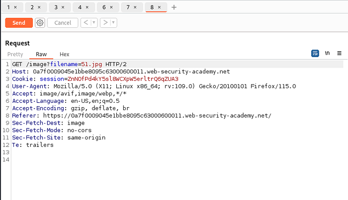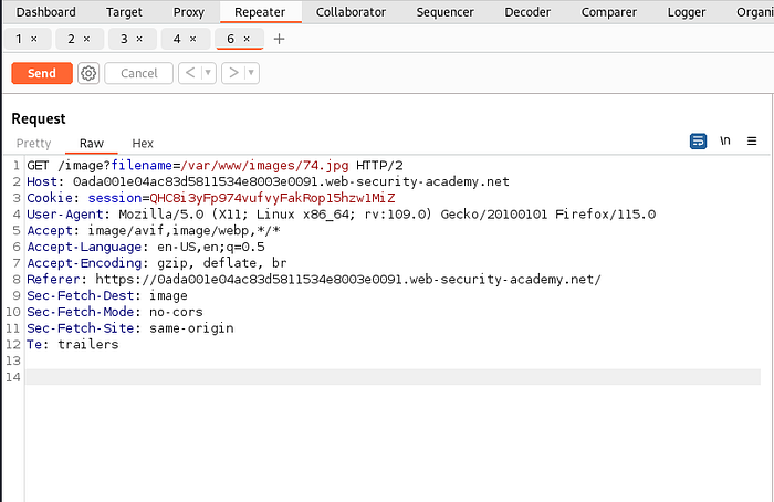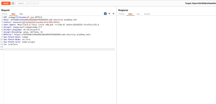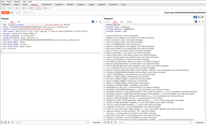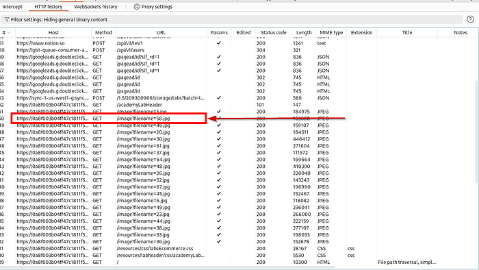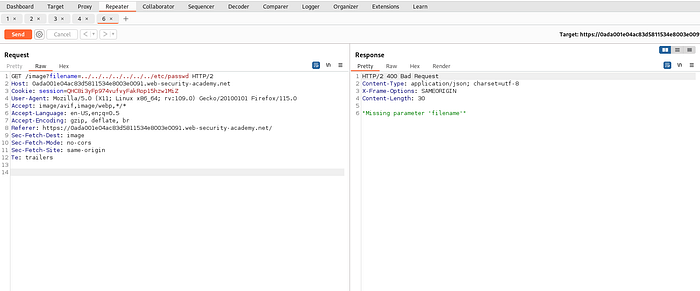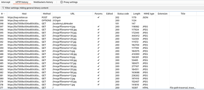 In the HTTP history, we can see filename parameter is loading various images, we will use one of these request , change the parameter and send the changed request to server.