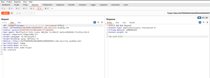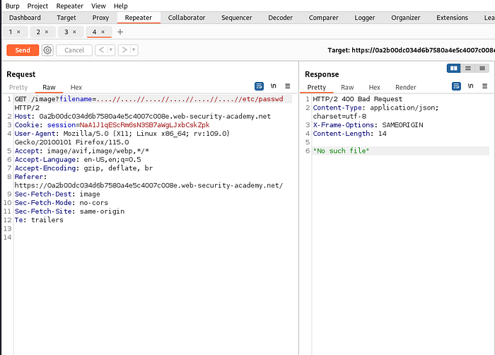 Same as before intercept the request and send it to repeater. For this lab traversal sequences is blocked but we can bypass this by providing absolute path.