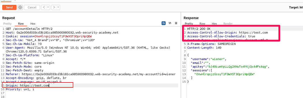 But when Origin header is set in this way “https://test.0ad800f00471924f82d91fd700c9002d.web-security-academy.net” , the response includes the Access-Control-Allow-Origin header , indicating that the server trusts requests only from its own domain.