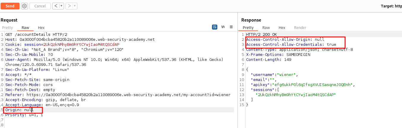 Starting the second lab “CORS vulnerability with trusted null origin”. Just like the fist lab our objective remain the same to retrieve Administrator’s API key.