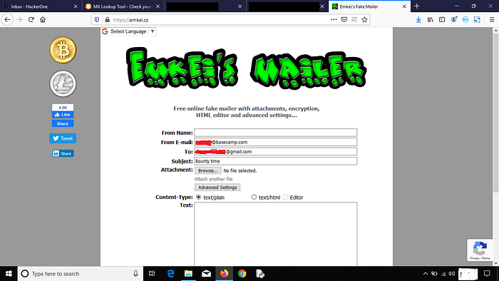 7. In From-email add the company’s email and in To add your own email and in Subject you can add anything (like Hacking You, Bounty Time etc.)