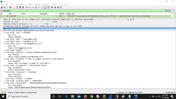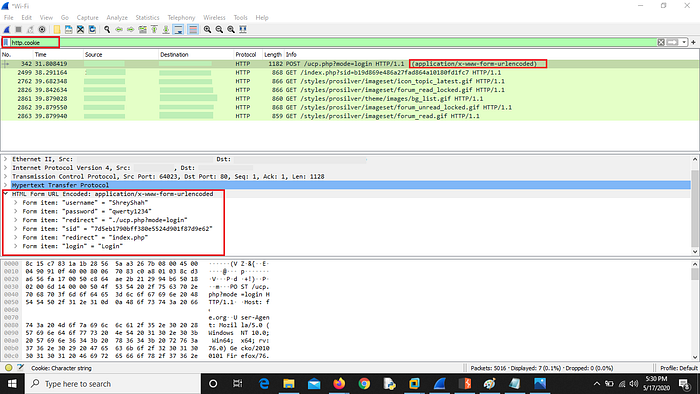 4. Go to WireShark and apply this filter : http.cookie