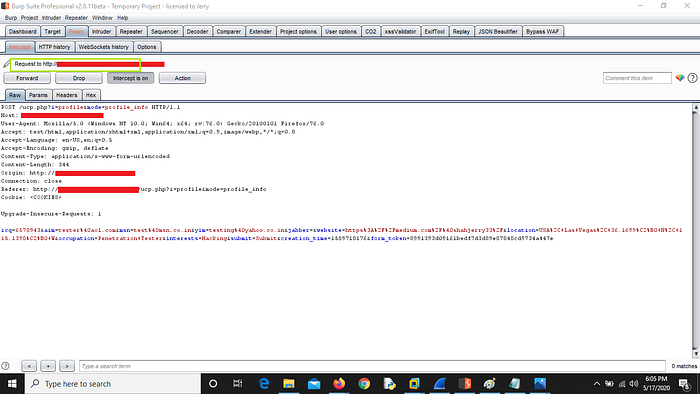 2. Fill the form and Intercept the request using burp suite to check if the POST request is using HTTPS or HTTP for saving or transferring data