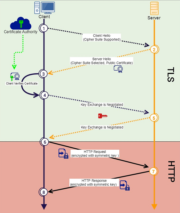 Server Response – The server encrypts and sends the HTTP response, which the client decrypts and verifies.