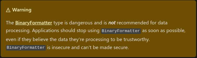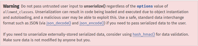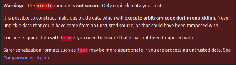 The root cause of insecure deserialization vulnerabilities lies in the assumption by developers that users won’t be able to easily tamper with the serialized objects. This leads to the direct use of potentially malicious serialized objects without any validation. Even the documentation of different serialization libraries available don’t recommend the use of serialization in applications. Take a look at this: Python