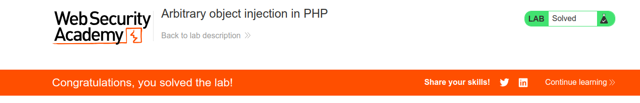 Run the above PHP code and you will get the base64 encoded serialized object. Now just replace your session cookie with this base64 encoded data in order to solve the lab.
