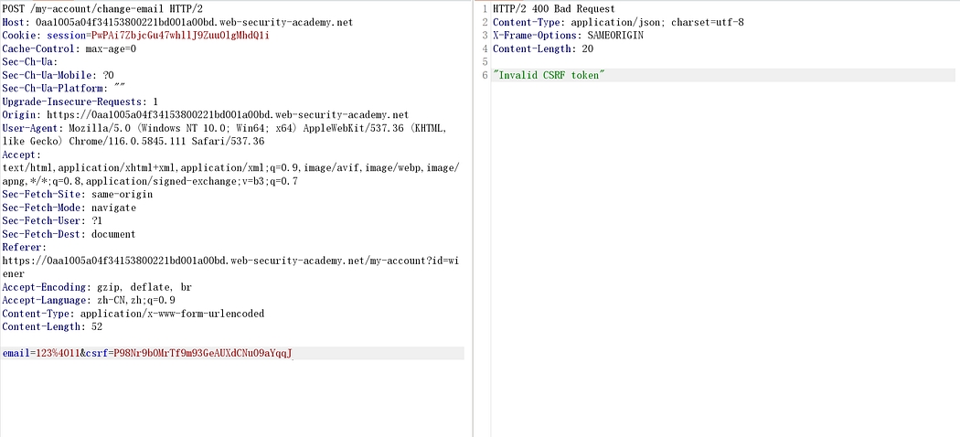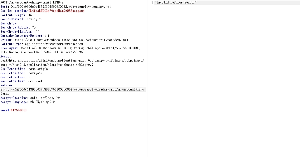 This lab’s email change functionality is vulnerable to CSRF. It attempts to block cross domain requests but has an insecure fallback.