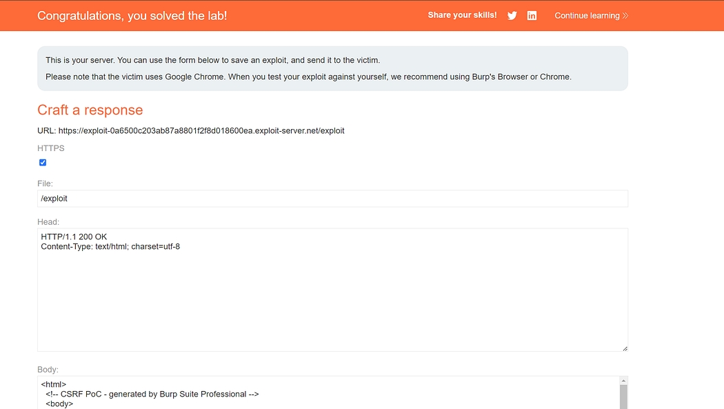 To solve the lab, craft some HTML that uses a CSRF attack to change the viewer’s email address and upload it to your exploit server.