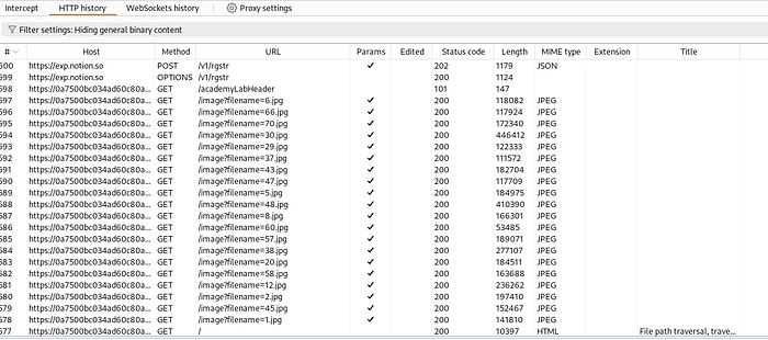 In the HTTP history, we can see filename